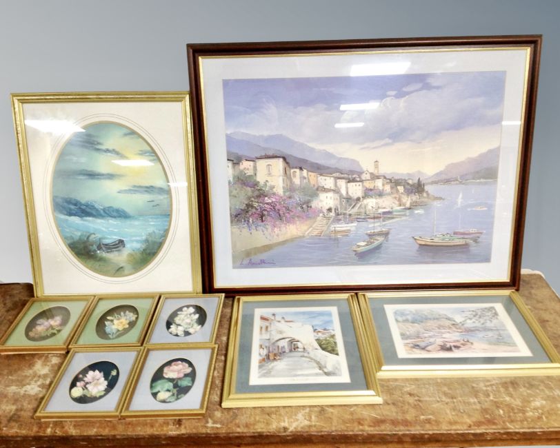 An oil painting depicting rowing boat moored on a beech, together with eight further various pictures and prints