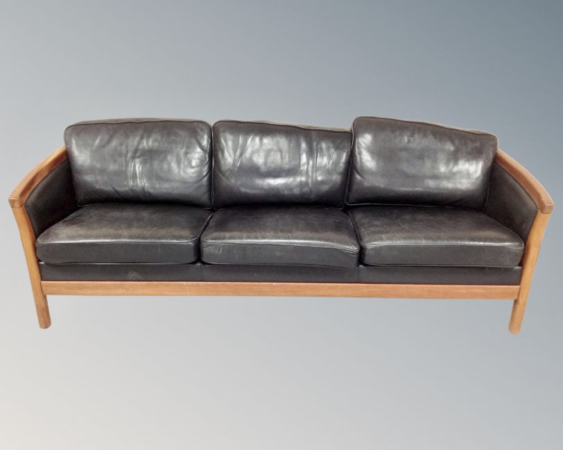 A Scandinavian wooden framed black leather three seater settee, length 220 cm