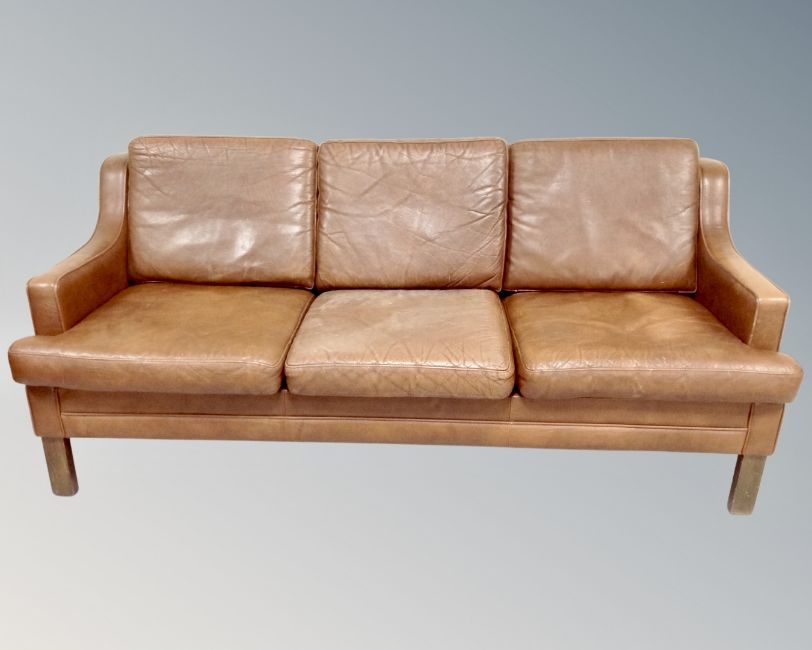A 20th century Scandinavian brown leather three seater settee (length 185 cm)