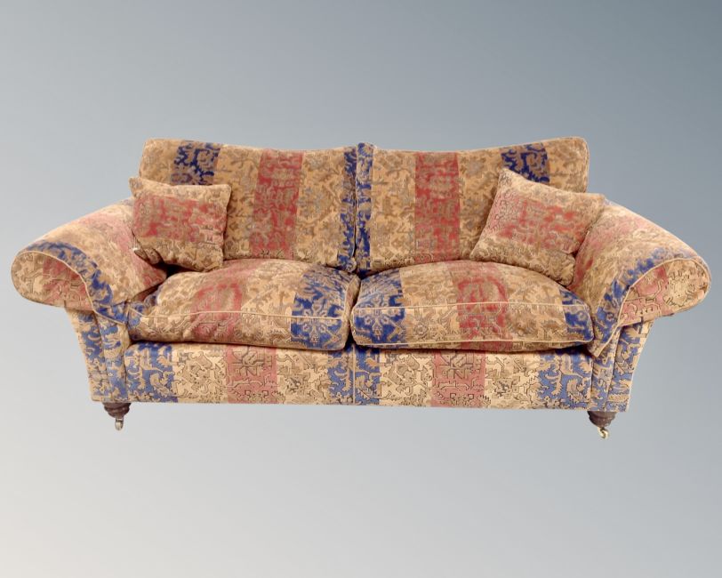 A contemporary Duresta three seater settee (width 230 cm) and matching two seater settee (width 190 cm) in three-tone fabric with cushions and arm covers raised on brass castors