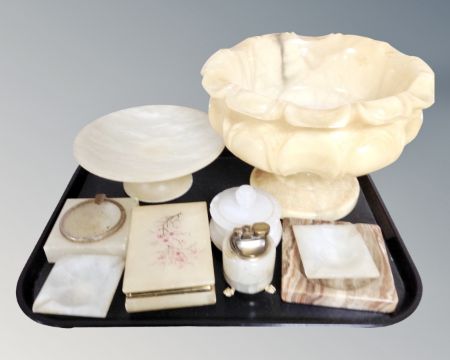 A tray of alabaster and onyx ornaments including pedestal fruit bowl, table lighter, trinket box etc