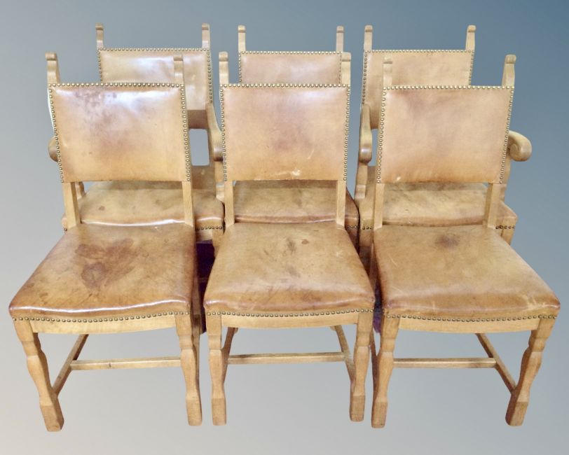 A set of six oak and studded tan leather upholstered dining chairs.