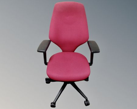 An office armchair upholstered in maroon fabric