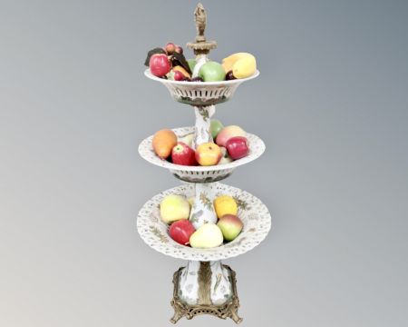 A three-tier porcelain and gilt metal table centrepiece comport, decorated with flowers and plastic fruit, height 82cm.
