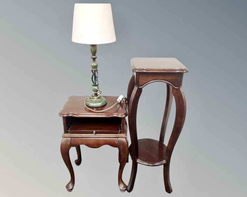 A telephone table on raised legs together with a two tier plant stand, both in a mahogany finish, together with a further Indian painted table lamp with shade.