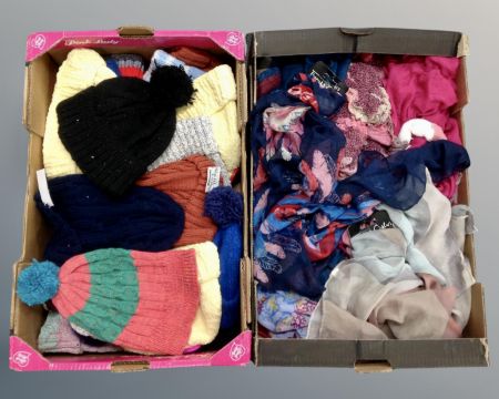 Two boxes containing lady's scarves and woolen bobble hats. (new)