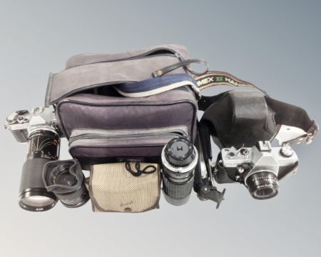 A box containing vintage cameras including Canon AE-1, Praktica MTL3 together with assorted lenses, accessories and camera bag.