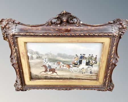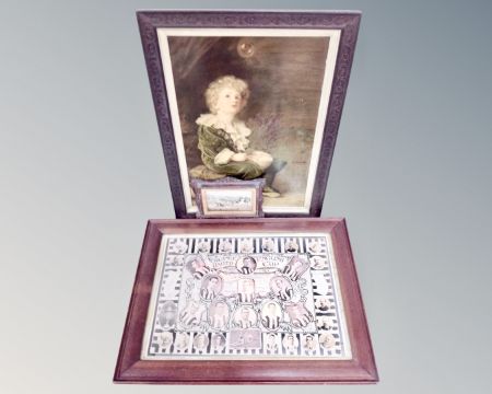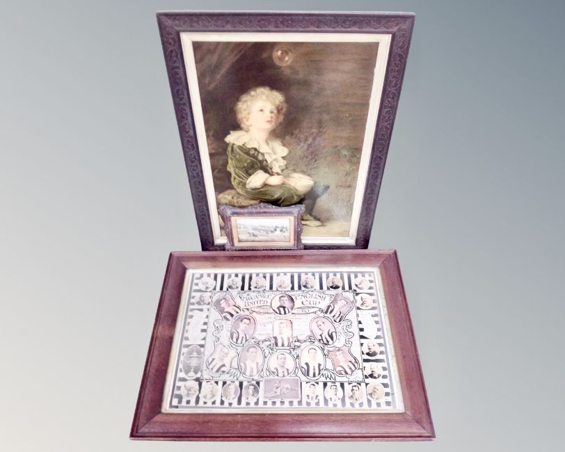 A Georgian hand coloured etching depicting a coaching scene, together with a Newcastle United football print and a further print depicting a child.