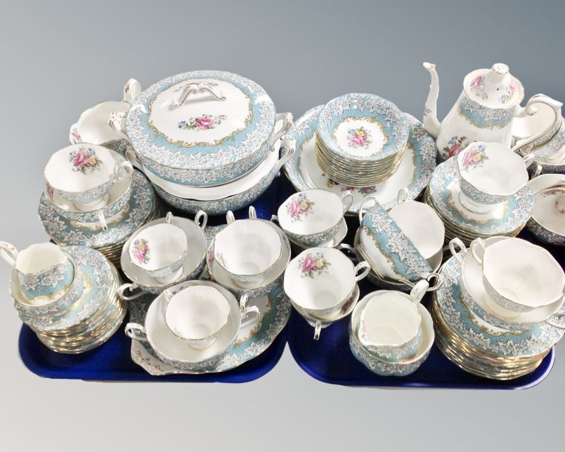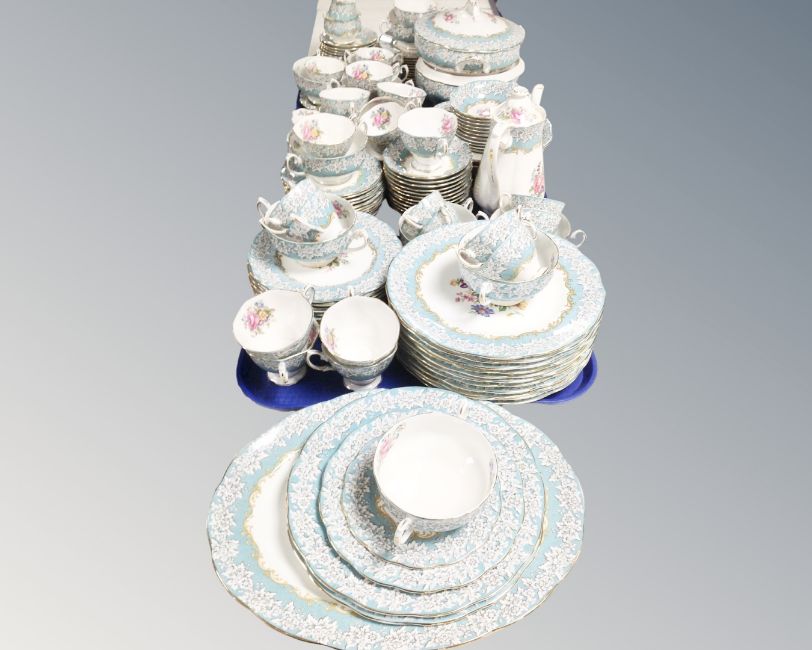 There is a set of three cake plates lacking their stand, the smallest of which has a hairline crack. One of the teacups has a hairline crack and one of the sugar bowls has a hairline crack. There is one side plate which is actually in the very similar Lady Carlyle pattern. All other pieces appear good.