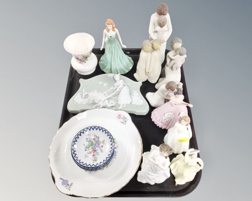 A tray containing assorted ceramics including Coalport, Royal Doulton, Brux and Bentley figurines, Willow tree figurines etc.