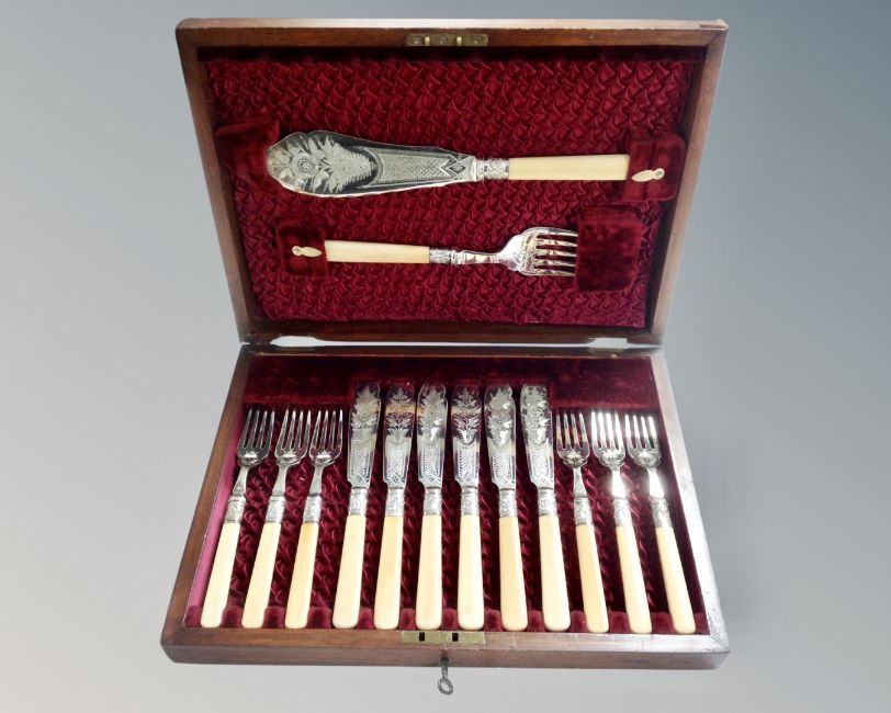 An Edwardian mahogany canteen of fourteen-piece fish cutlery set