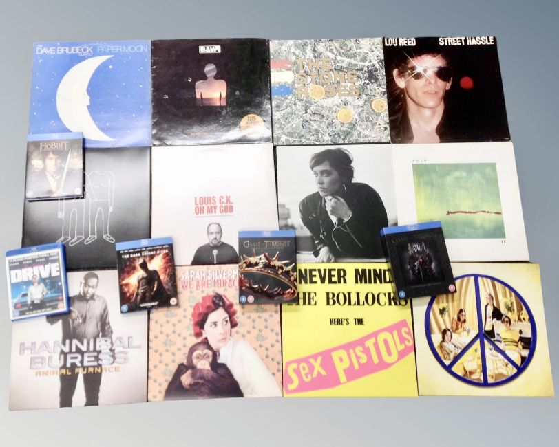 A box of a small quantity of vinyl LP's to include Sex Pistols, Stone Roses (reissues), Pulp, Catfish and the Bottlemen, together with a small quantity of Blu rays