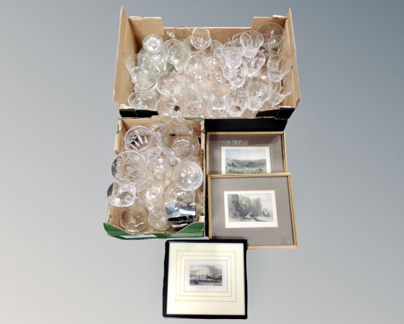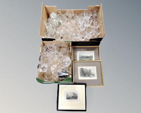 Two boxes containing 20th century drinking glasses, three 19th century hand-coloured engravings.