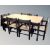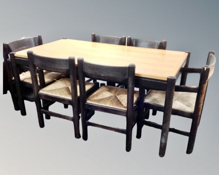 A 1970's two-tone dining table together with a set of six rush seated chairs