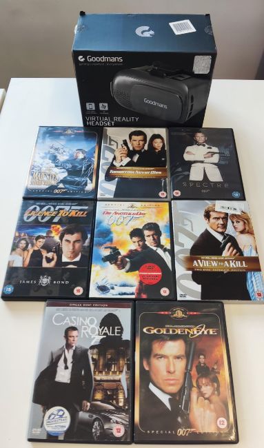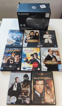 Star Wars Solo Chewbacca poster, Disney Sleeping beauty lithograph and James Bond DVD collection with VR headset.