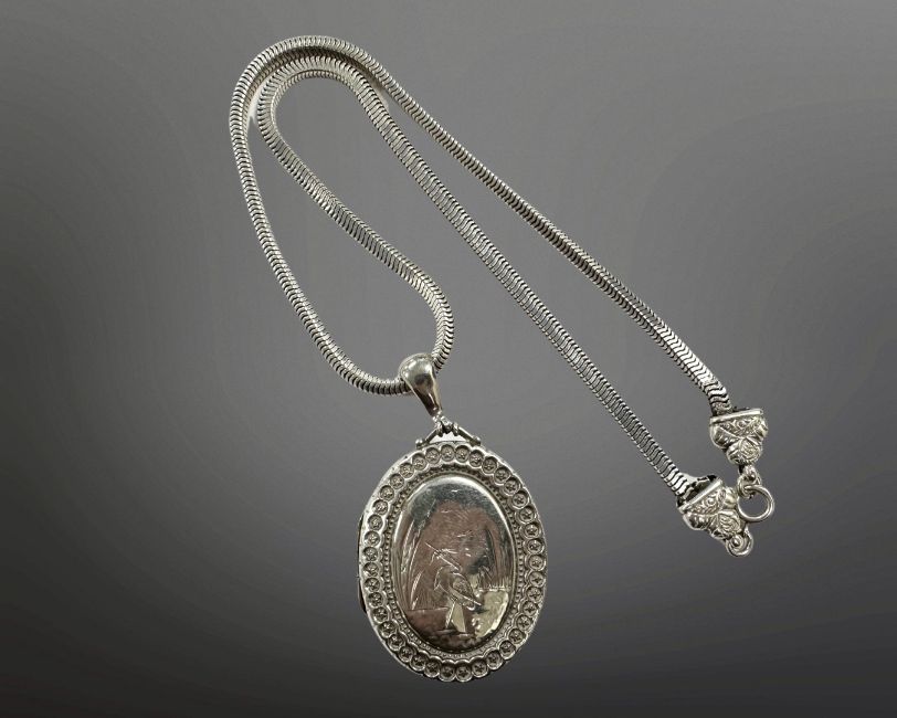 A silver locket on articulated necklace with ornate clasp, length 44cm.