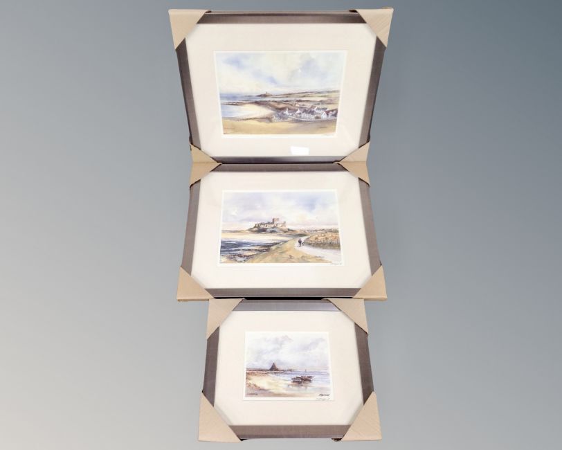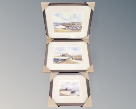 Three signed prints after Tom Macdonald depicting Bamburgh Castle, Lindisfarne and Newbiggin by the Sea, in frames and mounts.