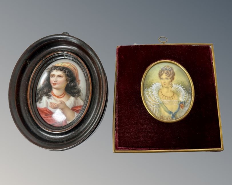 A portrait miniature on ceramic depicting a child wearing a head scarf and red dress, 5.5cm across by 7.5cm tall, together with a further portrait miniature depicting a lady wearing a tiara. (2)
