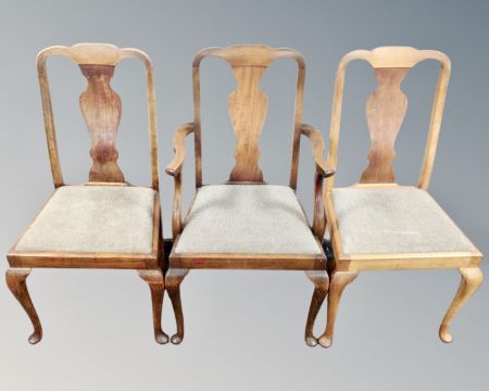 An eight piece walnut Queen Anne style dining room suite comprising of serpentine fronted sideboard, extending table and six chairs