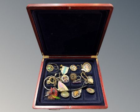 A coin collector's box containing a small quantity of costume jewellery together with a Durham Masonic badge on ribbon.