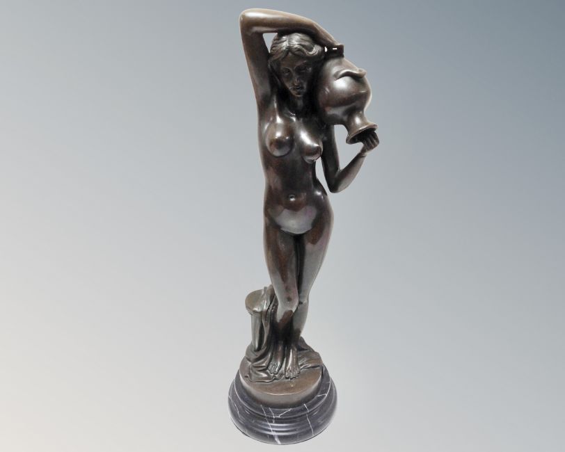 A bronze figure of a nude female carrying an urn, on marble socle, height 47 cm
