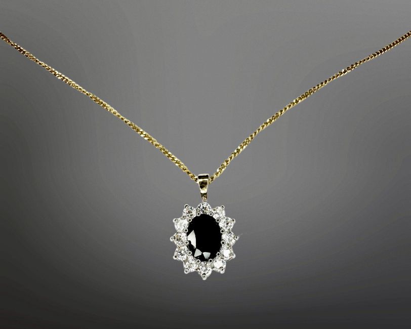 A 9ct yellow gold necklace with synthetic cluster pendant, 3.3g gross.