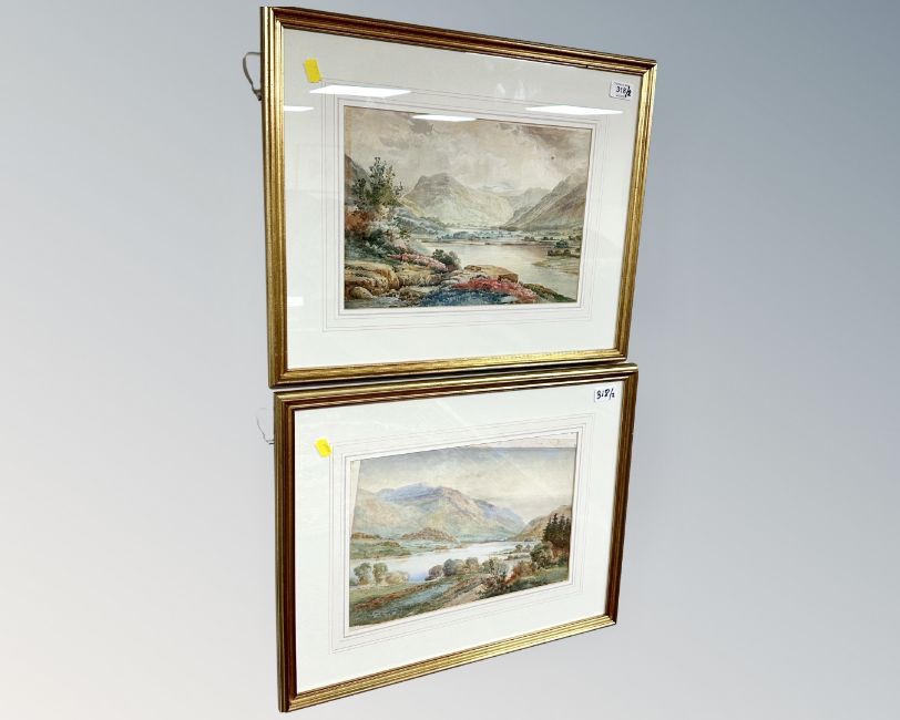 Malcolm Crosse (British 19th/20th century): Loch Scene with Mountains Beyond, watercolour, signed, 23 cm x 36 cm, together with the companion piece, framed as a pair. (2)