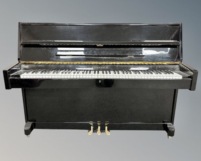 A Steinbach upright overstrung piano in ebonised gloss case, with tuner and keys. (width 146cm)