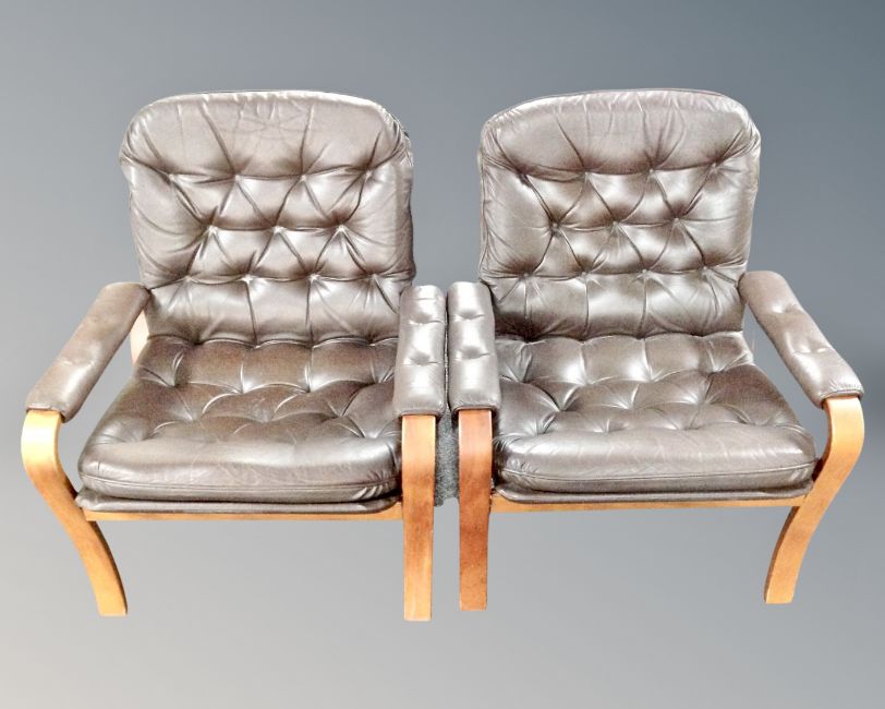 A pair of Scandinavian bentwood armchairs upholstered in brown button leather.