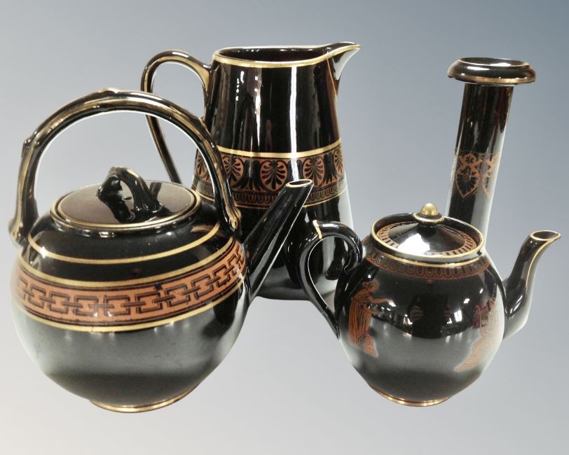 A tray of Greek style ceramics comprising of two teapots, a jug and a candlestick.