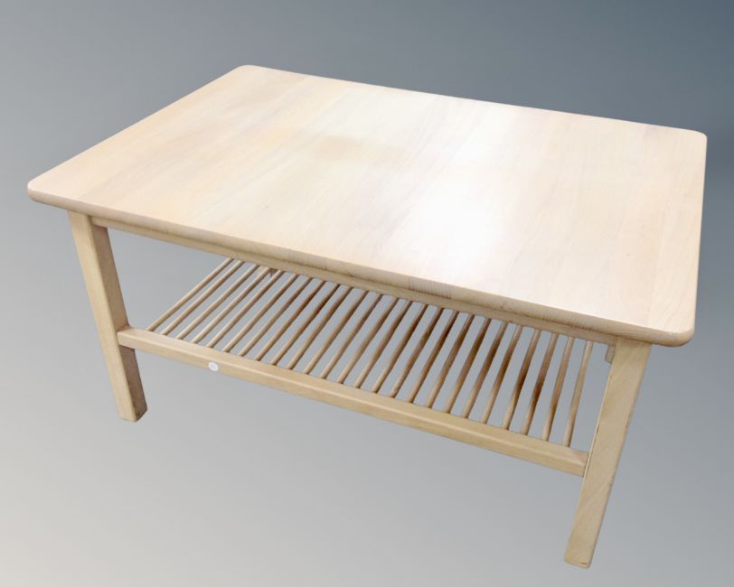 A Scandinavian beech effect coffee table with under shelf, length 100 cm