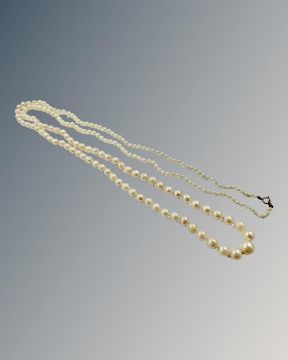 An early 20th century graduated pearl necklace, on 9ct yellow gold clasp, length 95 cm.