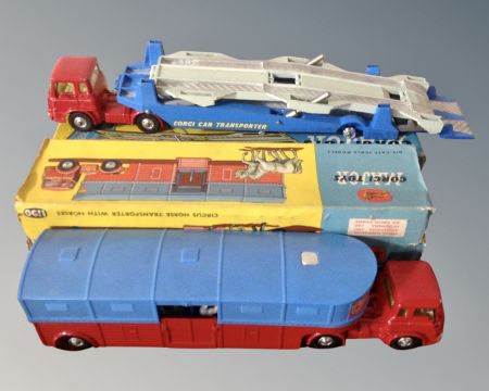 Two boxed vintage Corgi models comprising 1130 circus horse transporter with horses and 1105 Carrimore car transporter.
