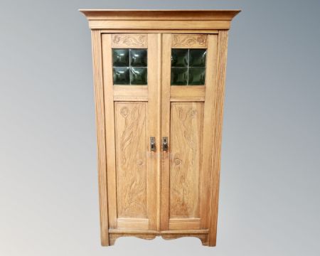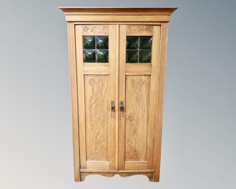 A continental carved oak double door bookcase with leaded glass panels. (width 100cm)