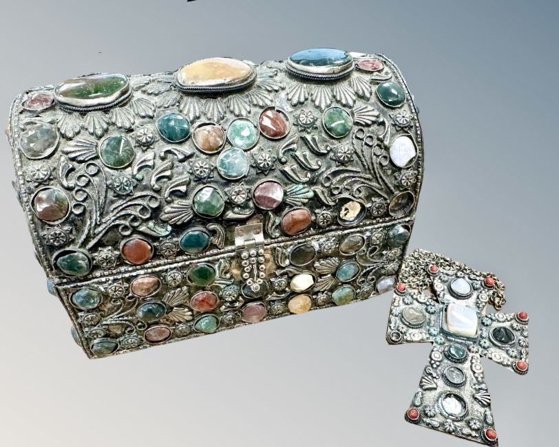 A Scottish white metal and hard stone-inset domed table casket, with repousse foliate decoration and all-over cabochon agate stones (some losses), together with a similar hard stone inset crucifix on chain and a quantity of loose stones and beads etc.
