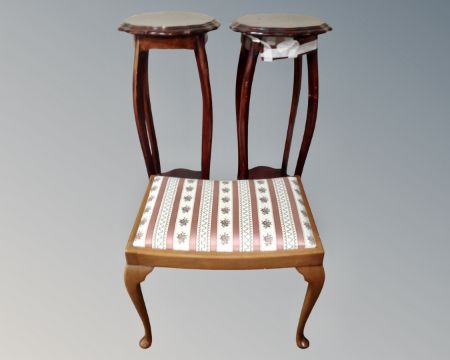 A pair of stained wood jardiniere stands together with a reproduction piano stool. (3)