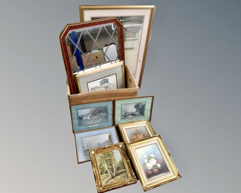 A box containing a contemporary mirror, gilt framed oil on canvas, further pictures etc.