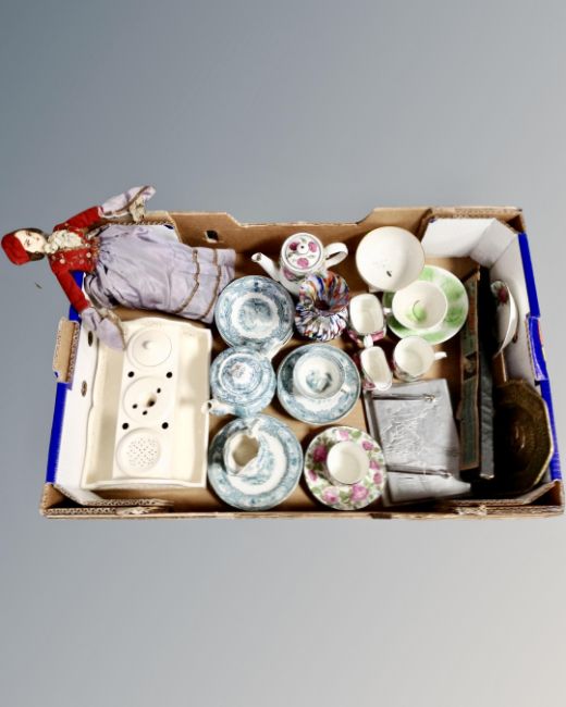 A box containing antique English tea china, mottled glass vase, pen stand, vintage doll etc.