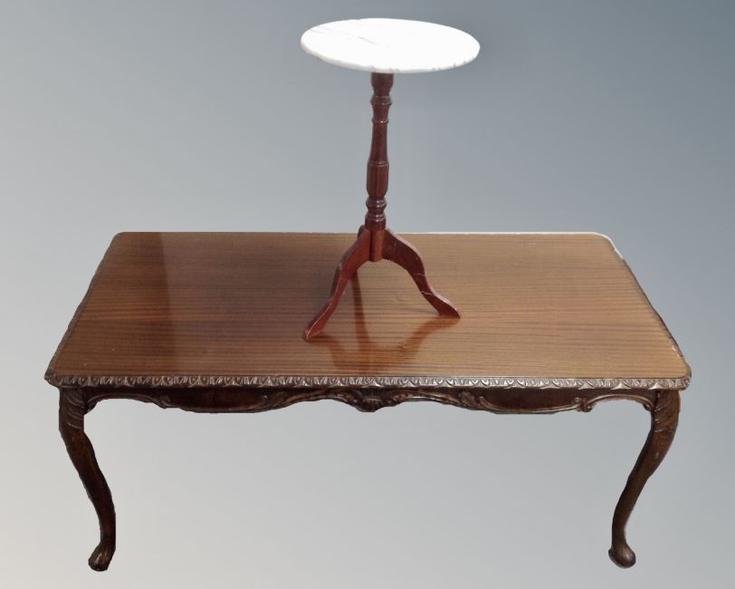 A carved coffee table on cabriole legs, width 120 cm and a marble topped tripod table