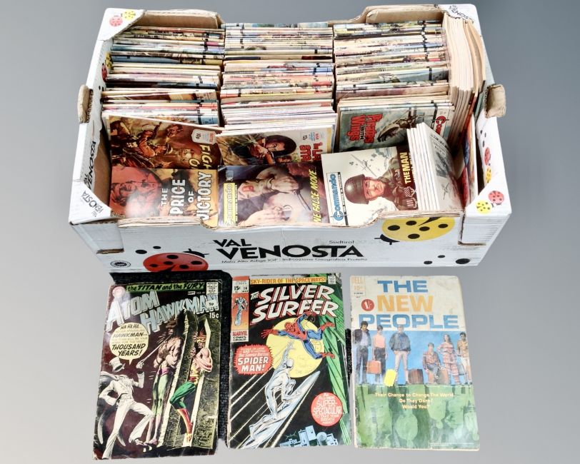 A box containing a large quantity of Commando books, The Last Stand books, Cold Steel, several comics including Marvel's Silver Surfer etc.