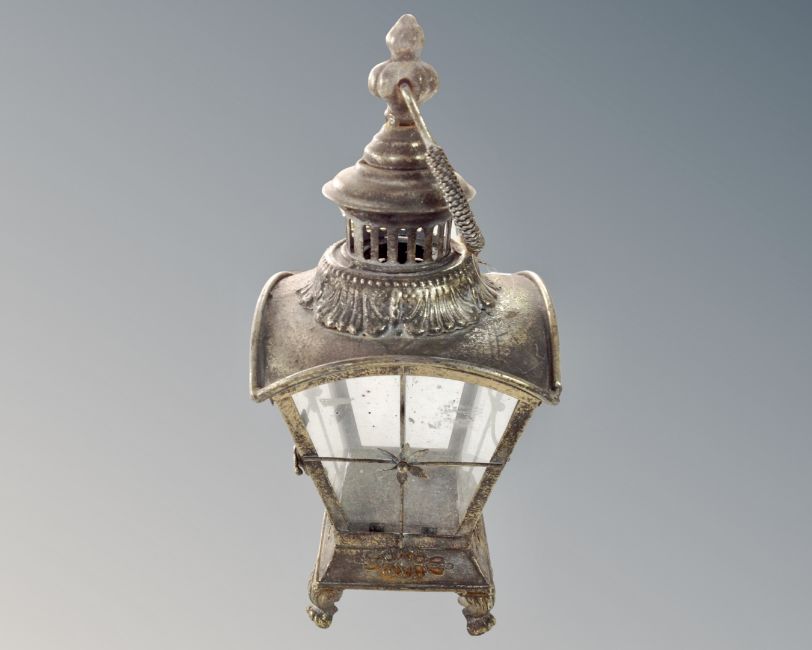 A brass hanging lamp.