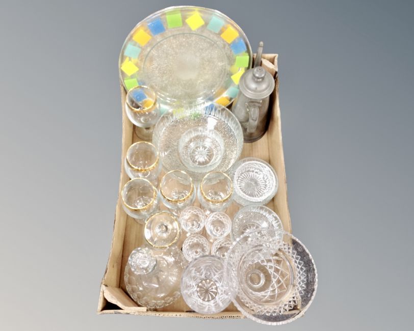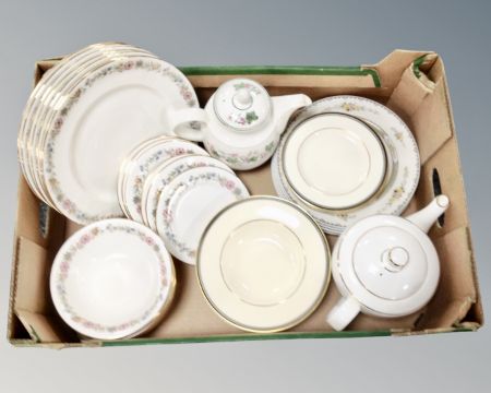 Three boxes containing Royal Doulton dinner china, 20th century glassware including set of wine glasses, decanter with stopper, further china, Majolica plate etc.
