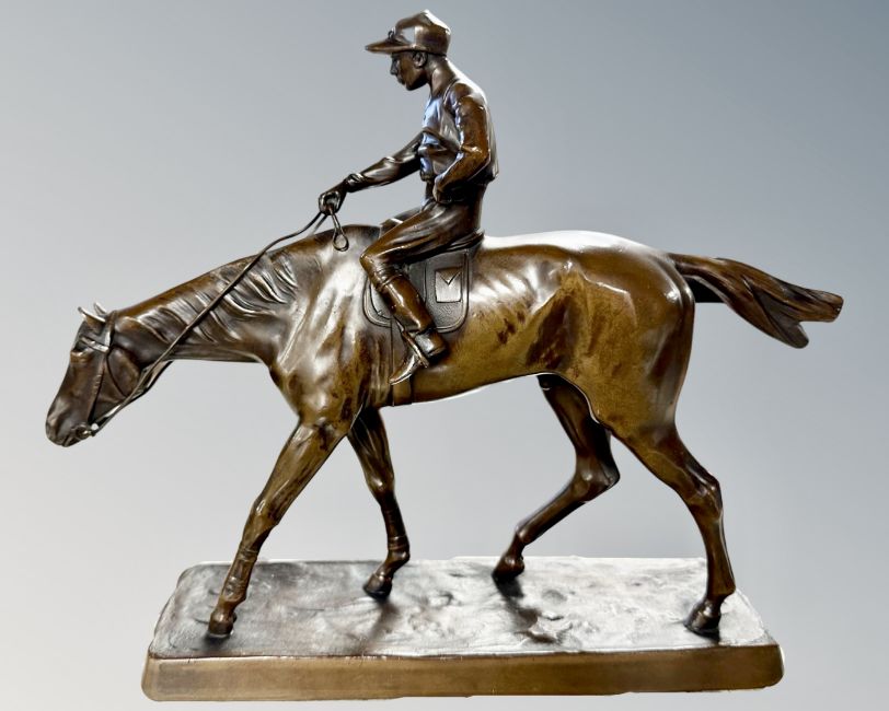 A bronzed metal figure of a jockey on horseback, length 27cm.