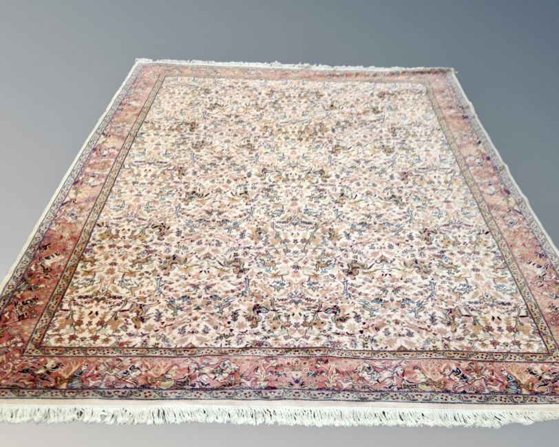 A machine made carpet of Persian Kirman design, on cream ground, 376cm by 273cm.