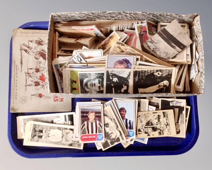A tray containing a large quantity of collector's cards including footballers, flags of the world, album of Wills cigarette cards.