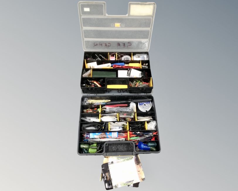 Two multi-compartment storage boxes containing fishing equipment including telescopic rod, floats, lures, line, barbles, hooks etc.