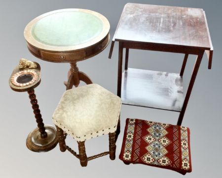 A flap sided two tier occasional table, drum table, two footstools and a smoker's stand