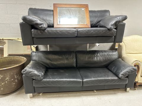 A pair of contemporary black leather settees on metal legs
