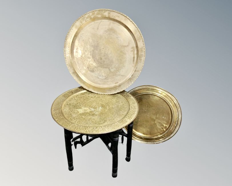 A folding brass topped Eastern occasional table together with two further brass trays.