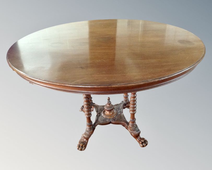 An antique mahogany circular pedestal dining table on carved base with paw feet
